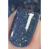 Majolica is a midnight blue nail polish with gold metallic flakes. Our speckled polishes are made with irregular-shaped flake pigments which gives it a unique, spotted finish.