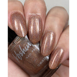 Perfectly Seasoned is a spice-inspired linear holo nail polish. Its warm-toned, light caramel tan base is perfectly complemented by a strong linear holo flame, while red undertones mimic a dash of cinnamon. Two coats will provide full coverage for most nail lengths.