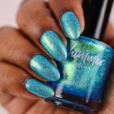 What A Catch nail polish is an eye-catching teal green shade. Pops of gold and peach appear in some lighting, while silvery holo glow flakes add sparkle and depth to this shifty shade. Two coats offer full coverage for most.