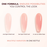 Strength, Color, and Shine - all in one swipe! Kiara Sky's NEW Tinted Rubber Top Coats have the strength, flexibility, and color of a rubber base with the high-gloss, no-wipe finish of a top coat—all in one easy step! This versatile formula is available in 8 universally flattering shades that can be used as a rubber base to strengthen nails or as a tinted top coat for a natural finish over natural nails or enhancements. Its medium viscosity, self-leveling formulation ensures even, bubble-free application while advanced adhesion technology prevents chips and cracks, ensuring durability for weeks. Ideal for cutting down your manicure steps without cutting corners on quality, these versatile tinted rubber top coats are a must-have for any efficient nail kit.