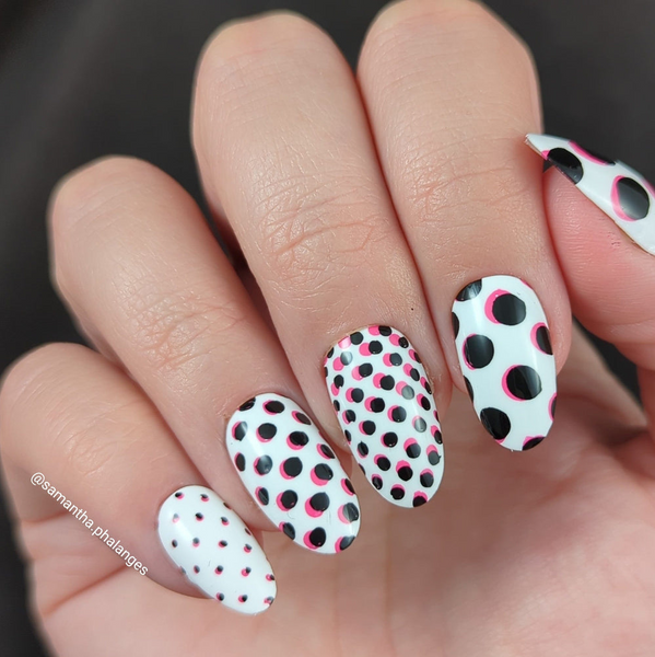 β’ GET SPOTTED: This plate offers a diverse selection of polka dot nail designs to suit any mood or style.