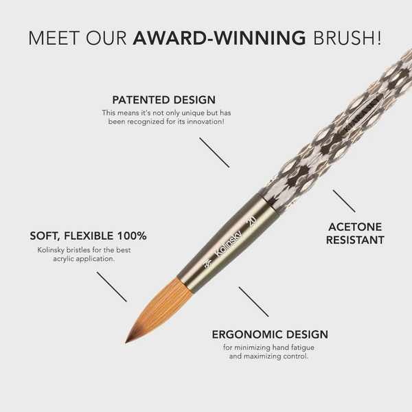 Experience unparalleled acrylic application with Kiara Sky's 100% pure Kolinsky Acrylic Brush. Proudly recognized as the #1 Acrylic Brush in the industry, our professional acrylic brushes reflect a perfect fusion of quality and innovation. Made to last, each brush has been carefully designed with a unique patented ergonomic design and is 100% hand-crafted from the finest materials. Each element of this Kiara Sky Acrylic Brush has been considered, from the stunning crystal cut handle and acetone resistant structure, to the soft flexible bristles that provide you with an effortless and smooth acrylic application.