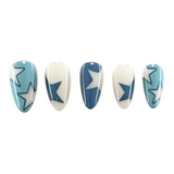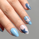 Our Supernova Press On Nails are all about bold, trendy vibes featuring bold star accents on a chic combination of dusty and baby blue hues. These short almond tips are perfect for dressing up for a special night or adding a little fun to your daily look.