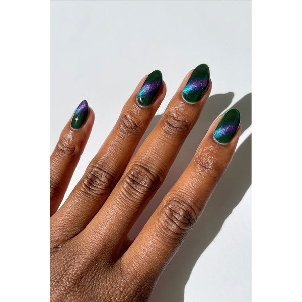 Mobius is a forest green jelly nail polish with mesmerizing magnetic multichrome pigment that shifts between teal bondi blue, iris purple and fusca bubblegum pink. Nothing subtle about it, you will need to clear your schedule before trying Mobius. It’s multi-dimensional shimmer as distracting as it is vibrant. Use our magnetic wand while polish is wet to activate the magnetic multichrome particles creating captivating 3D nail art designs. Don't forget your Magnetic Wand!