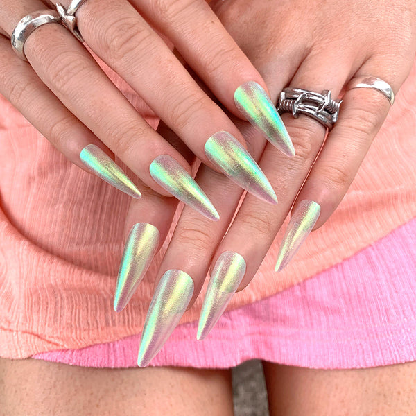 Unlike anything we have ever created, the shifting rainbow iridescent. Kaleidoscope is a shifting gold / green iridescent shade that will blow your mind! Incredible on its own and equally as mesmerising worn as a topper (strong colour effect over darker shades). You will witness the rainbow shift right before your eyes.