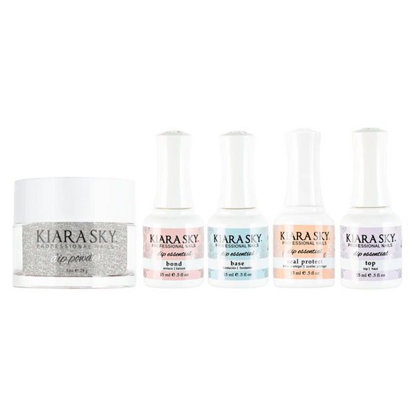 Get stronger, lightweight and natural long-lasting nails with our easy-to-use dip powder. Kiara Sky dip powder is formulated without harsh chemicals and has added vitamins and calcium to strengthen natural nails. Dip powder can be used on natural and artificial nails. #1 Bond: The first step in our dip system is our bond glaze. This goes on first to prep the nail and ensure all layers stick easily and stay put making for a tight seal and also nourishing the nail bed. #2 Base: The second step in our system is our Kiara Sky dip base glaze. This is used before dipping in powder; our base glaze allows the powder to adhere to the area applied and maintain long lasting wear. #3 Seal Protect: The third step in our dip system is our seal protect polish. This acrylic nail sealer is used to harden the powder and seal all previous coats so the nail can be drilled, filed, and buffed. #4 Top Coat: The fourth step in our dip system is the top coat glaze. This acts just like any other top coat creating shine and protecting nails from the sun’s harmful rays. It is specially formulated to work with the dip powder.