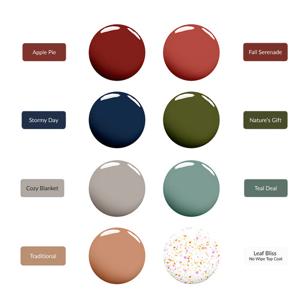 This fall, we’re celebrating the beauty of the season with the Harvest Hues Bundle. Each shade is thoughtfully formulated to provide rich pigmentation that applies seamlessly for a flawless, even coverage. Complete your stunning manicure with our advanced no-wipe top coat, engineered to amplify your nails' shine while leaving no sticky residue behind.