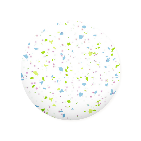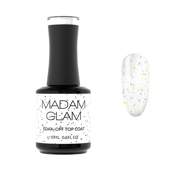 Dive into a world of shimmering glam. This transparent top coat is adorned with delicate pastel flakes, adding a touch of iridescence to any manicure.